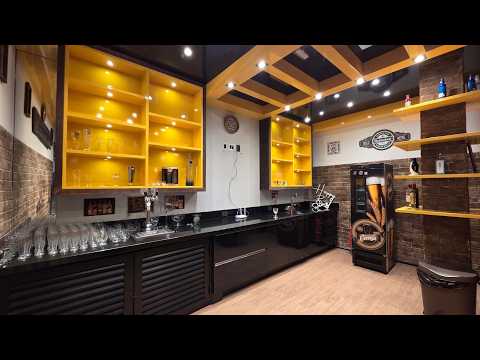 Um dos grandes diferenciais desta residência é o amplo espaço de entretenimento, projetado para receber convidados com conforto e sofisticação. O ambiente conta com um bar completo com balcão, prateleiras iluminadas e adega, além de uma área gourmet equipada com churrasqueira profissional e cozinha de apoio.