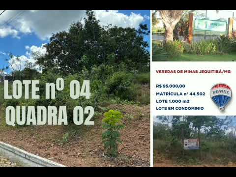 Lote de terreno de nº 04, quadra 02, medindo 1.000 m², situado na Rua 01, no bairro Veredas de Minas II, no município de Jequitibá, confrontando pela frente 20,00 m com a dita rua, lado direito 50,00 mcom a dita rua, lado esquerdo 50,00 mcom o lote 03 e fundos 20,00 m com o lote 14., também dentro do Condomínio Veredas de Minas em Jequitibá - MG**